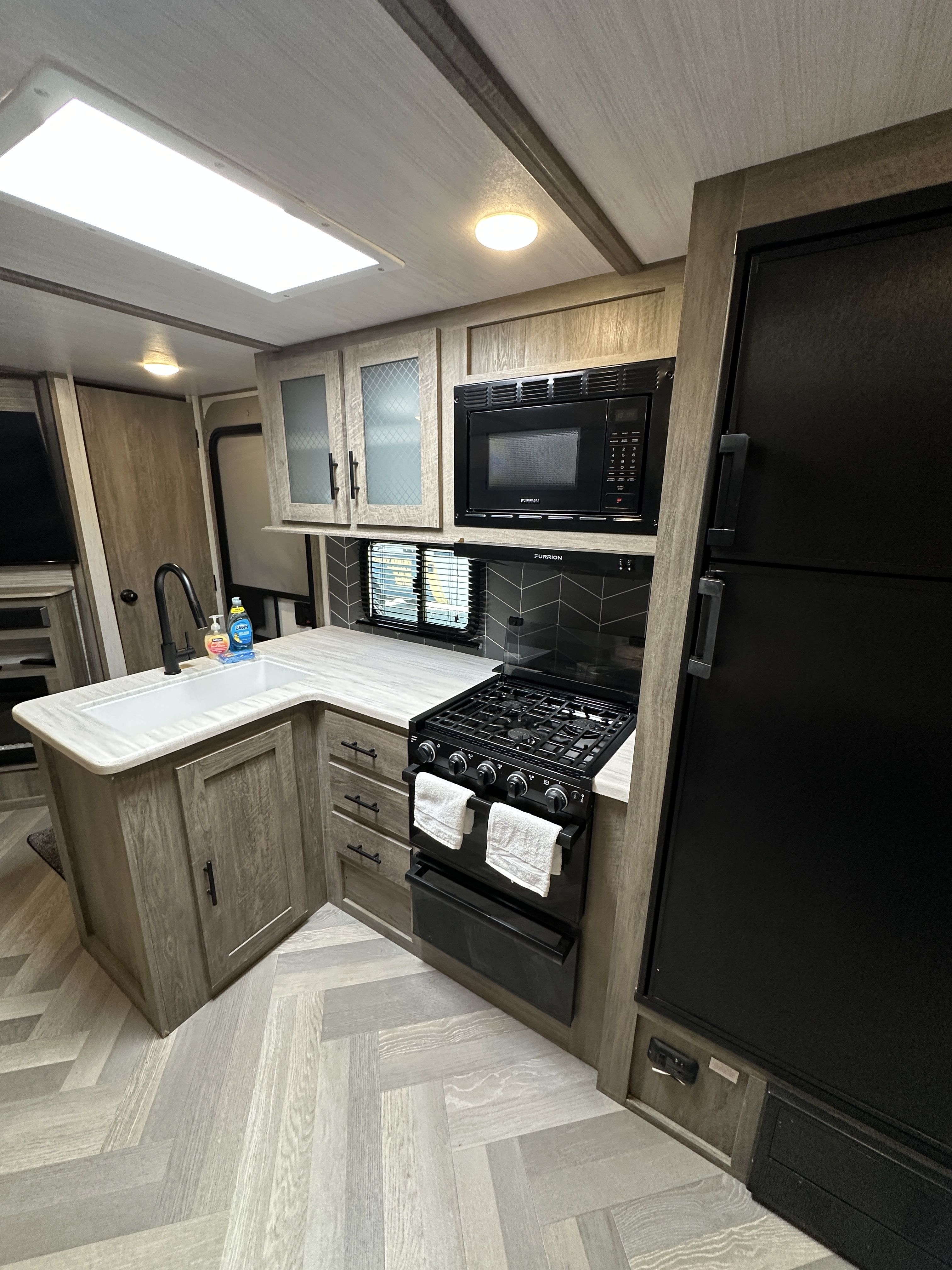 -includes fridge freezer combo that runs on propane when not on shore power or electric when at a campground.