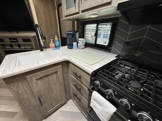 Rig includes full kitchen with propane stove, sink, microwave and oven.