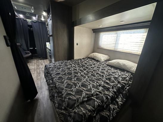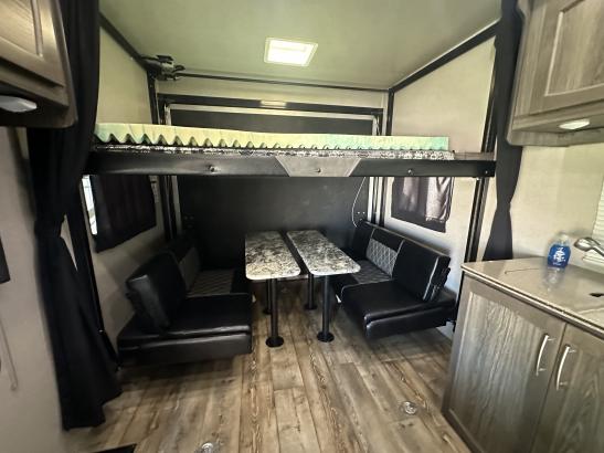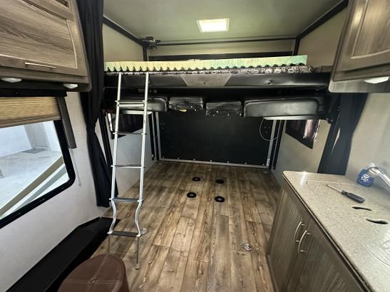 Rear Queen Bed: Drops from the ceiling with ladder access and an upgraded memory foam mattress (300 lb. combined weight limit). Ideal for teens, small adults, or single sleepers.