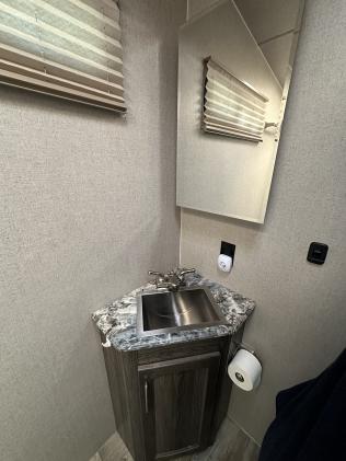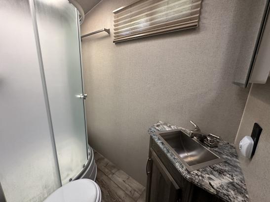 Stay fresh even while boondocking. The main bathroom features a corner shower, toilet, and vanity, offering both convenience and privacy with room to move around.