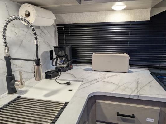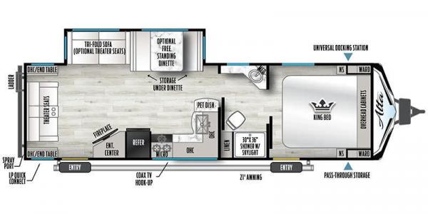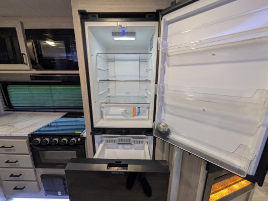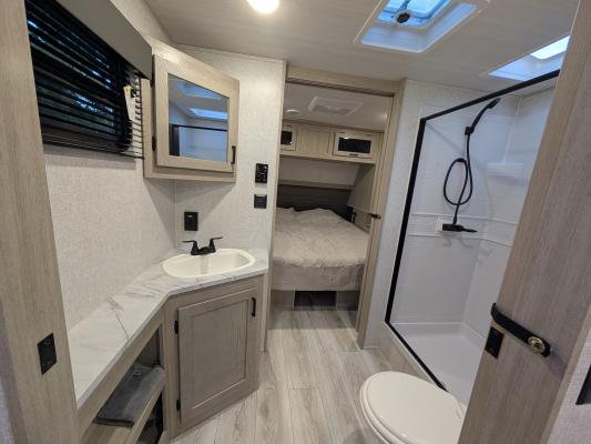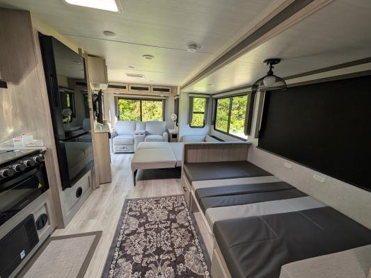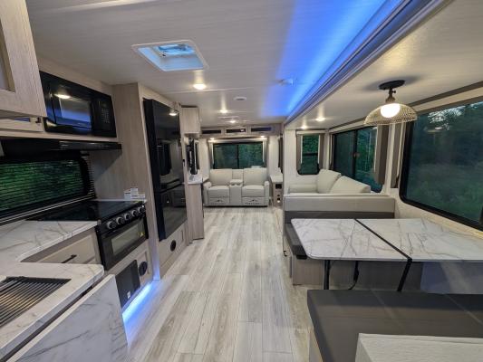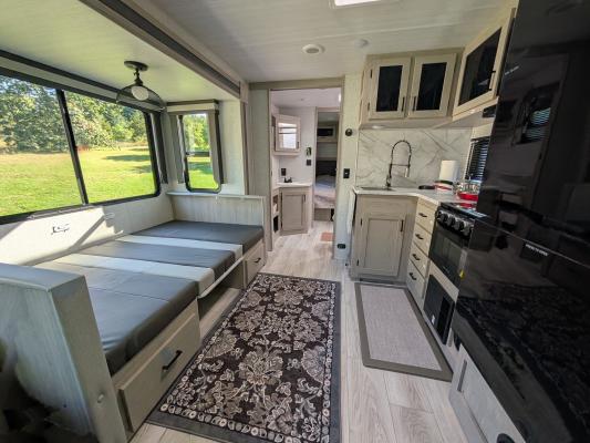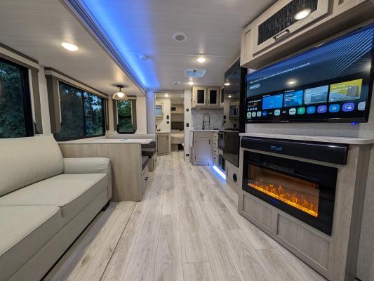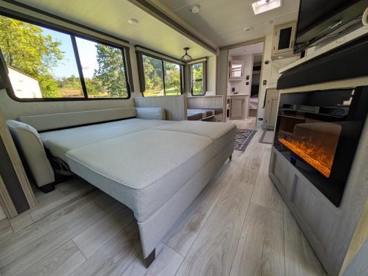 Even as the weather cools down, our new 2025 East to West Alta 2850KRL prioritizes a comfortable and spacious indoor camping experience, starting with the inviting rear living area featuring plush theater seating, convertible sofa, and a large slide-out for expanded living space that feels more like a house than a camper. It includes central heating and air conditioning from end to end. You'll find modern touches like daylight LED lights and black roller shades, creating a stylish and functional feel. The private front master bedroom, complete with a king-size bed, ensures restful nights. The walk-through bath includes a shower skylight, filling it with natural light. When it's time to unwind, the cozy fireplace and mood lighting adds warmth and atmosphere, making this new camper feel like a true home away from home. Plenty of rainy day indoor play space, books and games for the kids too!